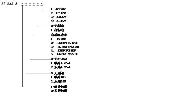 舉例如下:?jiǎn)温方佑|器,2路通訊接口,1路4-20mA輸出接口,電機(jī)額定功率37KW,無漏電檢測(cè),裝置電源為AC220V,則型號(hào)表示為:KW-MMI-A-121401。